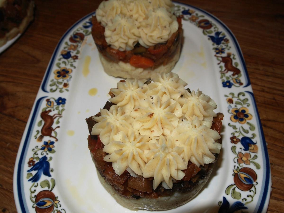 Decoración opcional: Quitamos los moldes y rellenamos una manga pastelera con boquilla de estrella, de puré de patatas, y decoramos nuestro pastel o pastelitos. Luego lo gratinamos en el horno hasta que se dore un poco y listo.