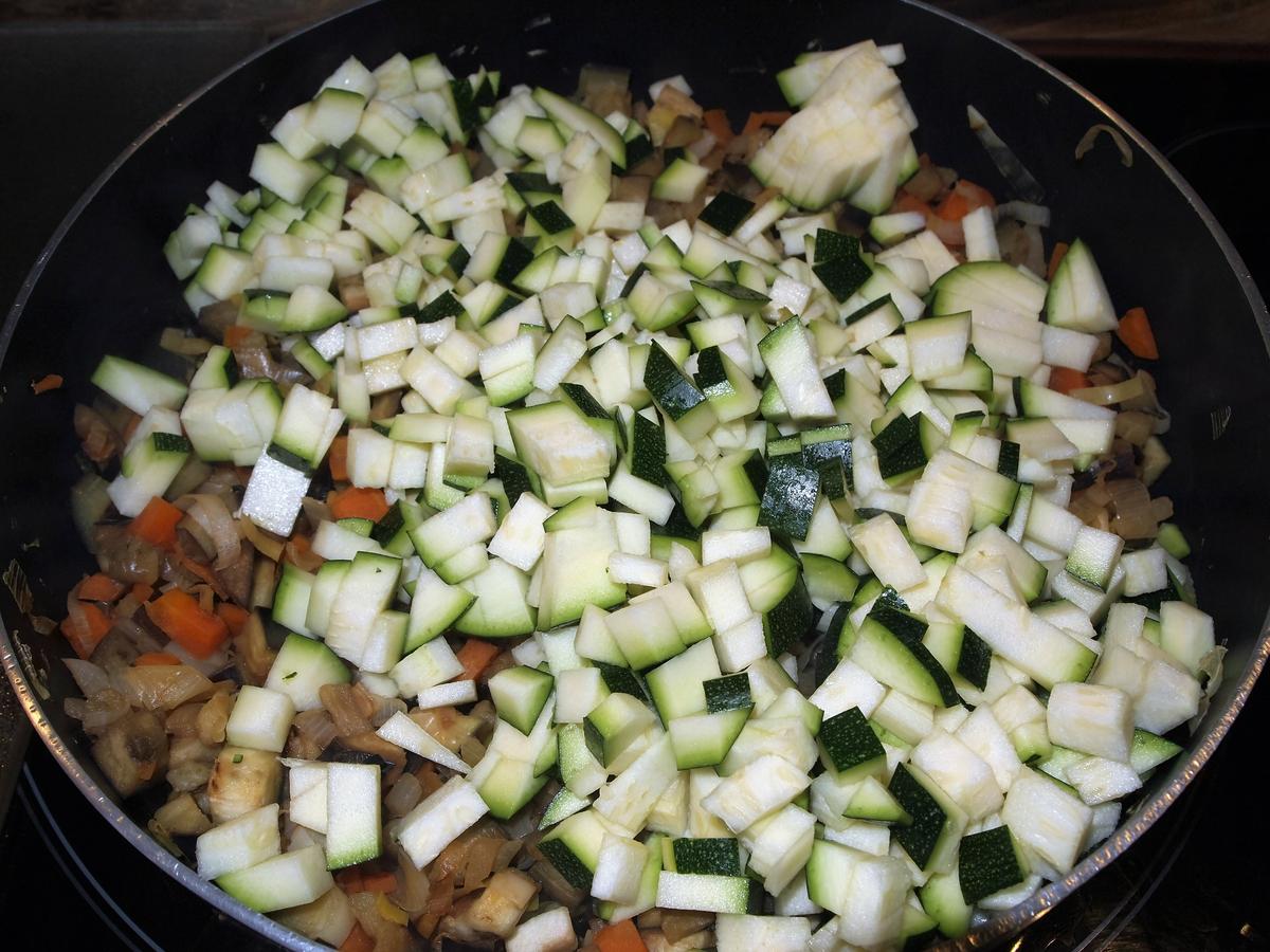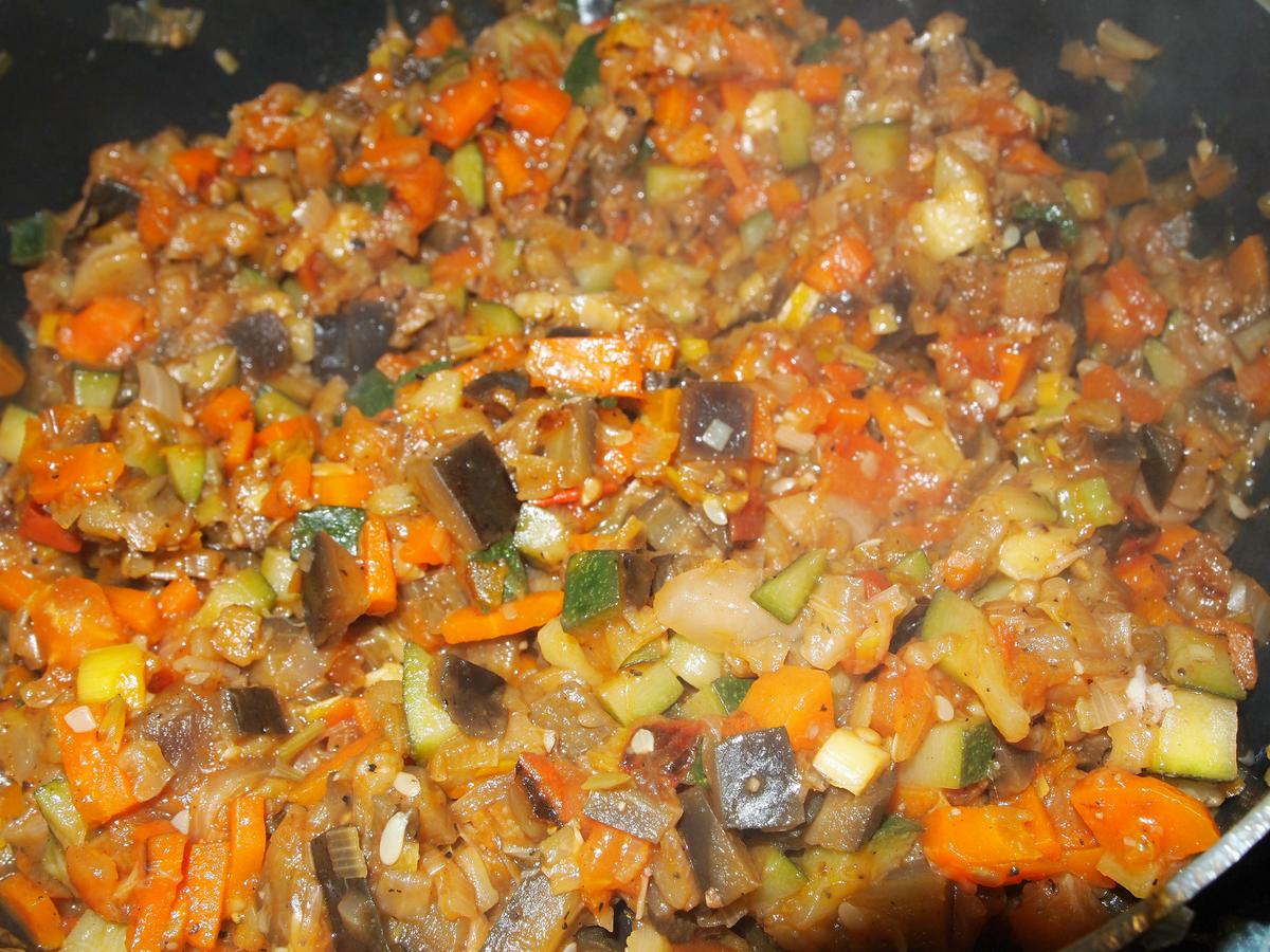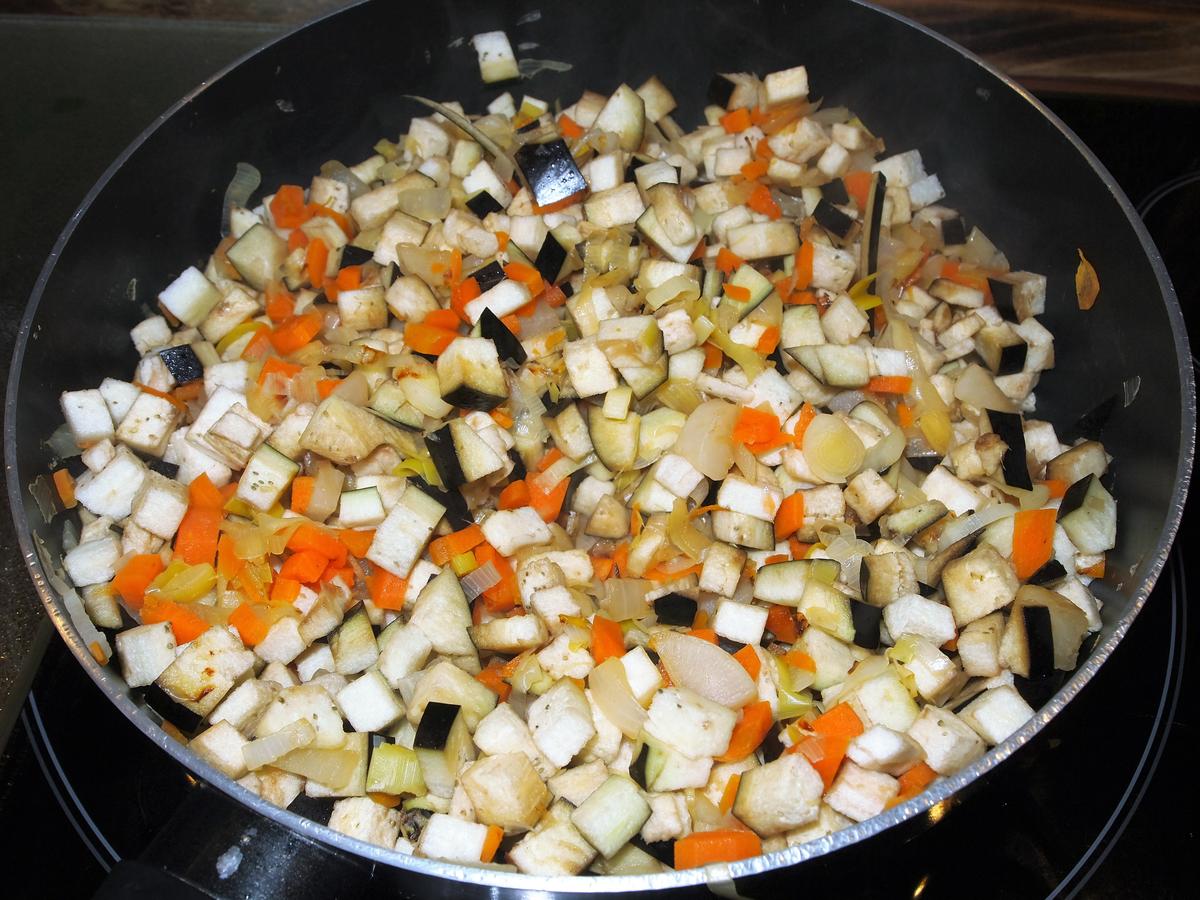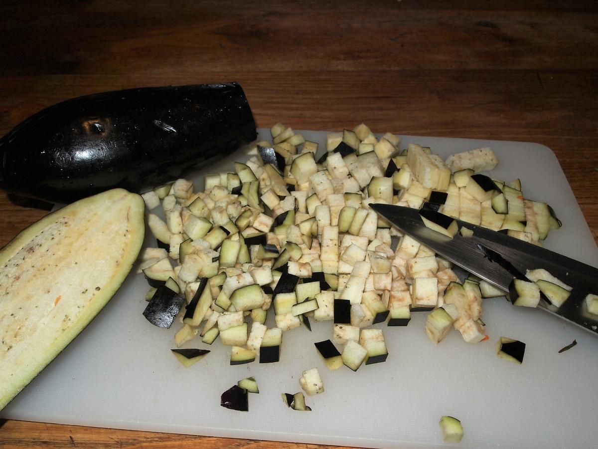 Mientras lavamos bien las berenjenas y las troceamos igualmente en daditos, cuando los puerros, cebollas y demás comiencen a transparentar agregamos nuestras berenjenas, unos 5 minutos.