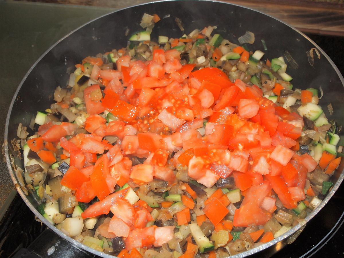 Turno de los tomates, mismo procedimiento, lavar y cortar y a la sartén. Salpimentamos todo al gusto y dejamos que se vayan haciendo las verduritas a fuego medio, removiendo de vez en cuando. Por lo menos 15-20 minutos.