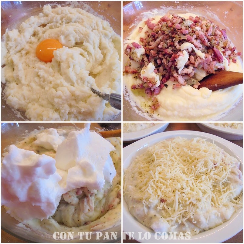 1. Haz el puré de patatas en copos como tengas por costumbre, de la manera tradicional o al micro, con leche y agua pero no le pongas mantequilla, sólo un poco de sal.