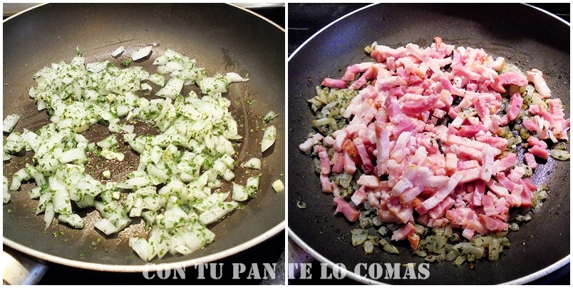 3. Cuando la cebolla esté blandita añadimos el bacon y lo sofreímos hasta que esté bien dorado.