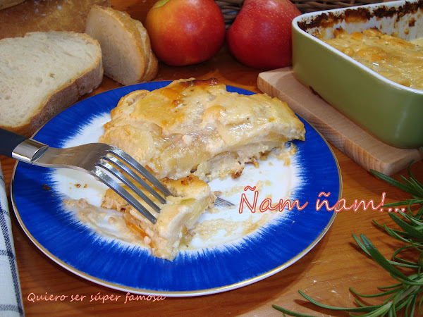- Cortar las patatas y las manzanas muy finas y distribuir en capas alternando patata y manzana, terminando con una de patata. Dejar un pequeño borde alrededor de la bandeja para que pueda entrar con facilidad la crema de queso.