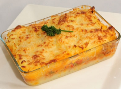 Unto el molde con una capa de puré de 1 cm de espesor aproximadamente, cubro esta base con el relleno, rocío con los huevos duros picados y tapo con el puré restante. Si te apetece, puedes rociar la superficie del pastel con queso rallado y disponer encima trocitos de mantequilla, lo llevas al horno a temperatura moderada, hasta que se dore la superficie y a comerrrrr !!!