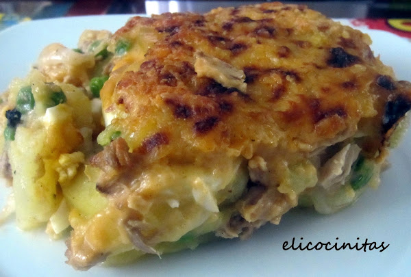 Para montar el plato cogemos un molde de unos 4 dedos de alto y empezamos con las capas. 1ª capa de patatas, una parte de la cebolla, huevo duro, atún, guisantes y un poco de la bechamel con tomate. Seguidamente volvemos a empezar con otra capa de patatas y hacemos otro piso con los mismos ingredientes. Por último tapamos con una tercera y última capa de patatas. Cubrimos el pastel con la bechamel que nos queda y con el queso rallado.