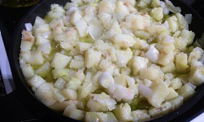 Pela y lava las patatas. Corta en cuadraditos, como si se tratase de una tortilla. Pon abundante aceite a calentar en una sartén, incorpora las patatas con la sal y pon encima la cebolla picada en trozos no muy pequeños.