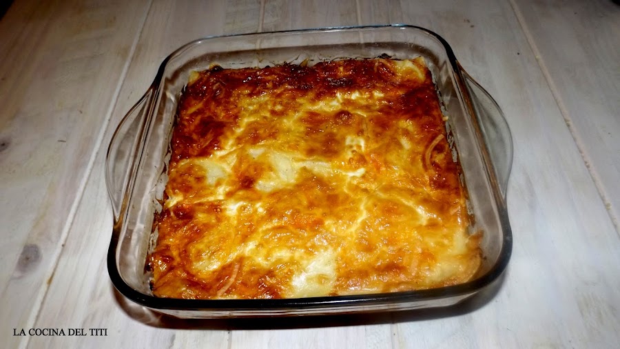 3º Una vez puesta todas las capas batimos los huevos con la nata (crema de leche) y se lo echamo por encima.