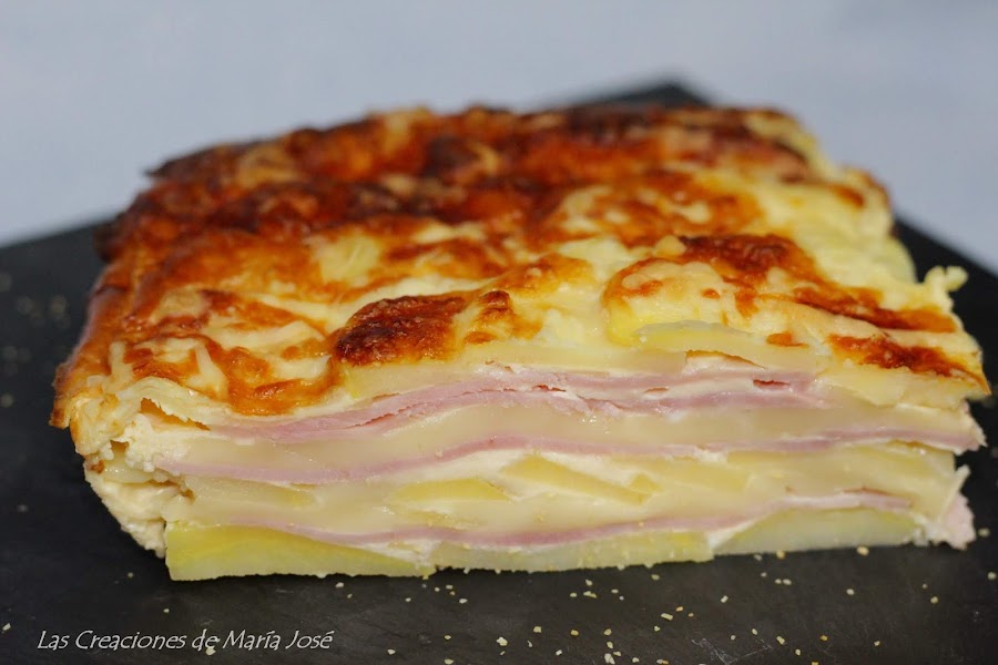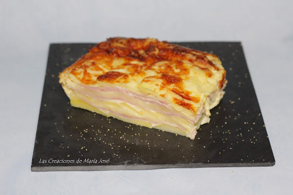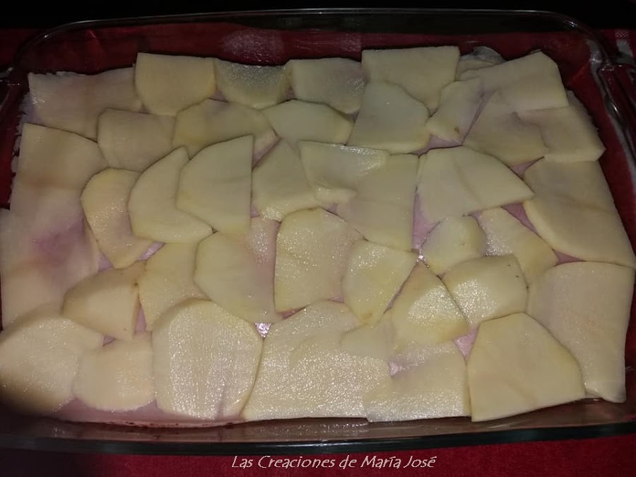 En una fuente apta para horno colocamos una fila de patatas, encima jamón de york y encima una fila de queso. Vamos haciendo así tantos pisos como queramos terminaremos con una fila de patatas.