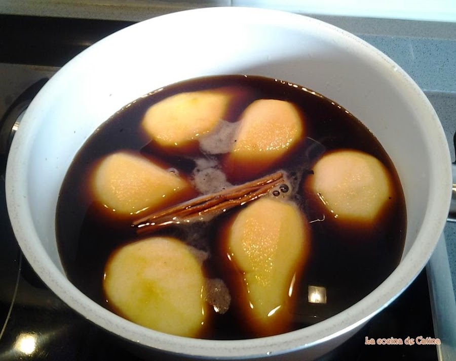 Poner un vaso de agua, el azúcar y la canela en un recipiente y cocer cinco minutos, incorporar las peras y el vino, y dejar cocer 15 minutos más a fuego medio.