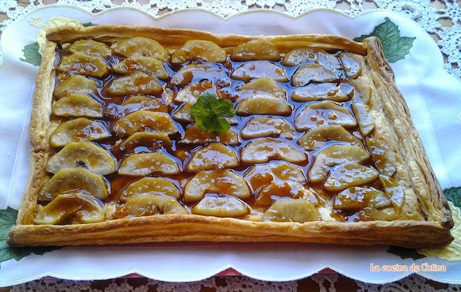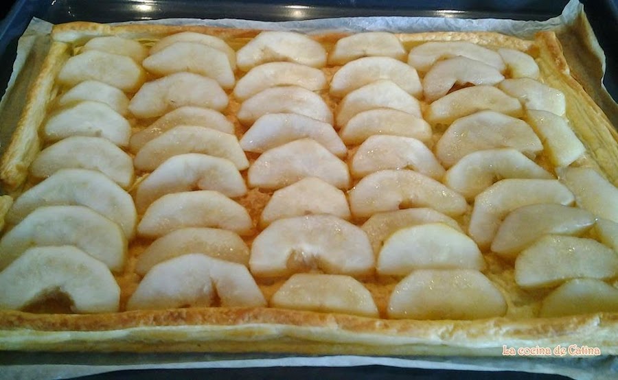 Cortar las peras en medias lunas y cubrir la masa con ellas.