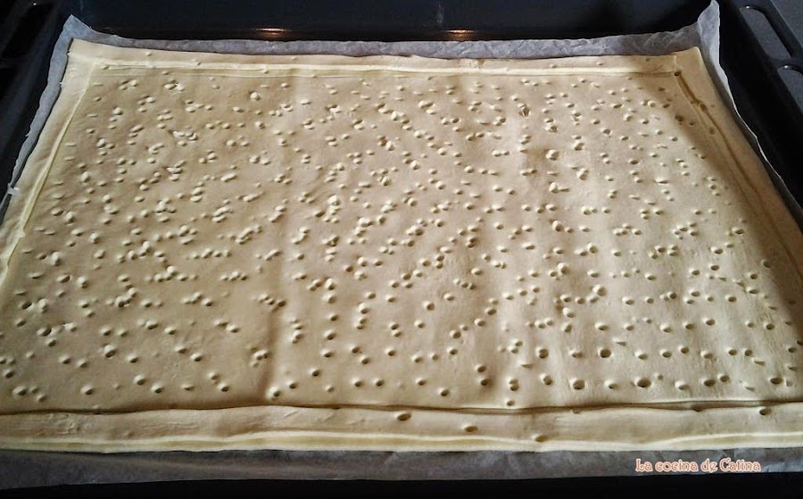 Colocar el rectángulo de masa de hojaldre en una bandeja de horno con papel sulfurizado, pincharla y pintarla con la clara de huevo.