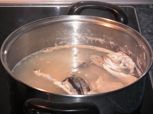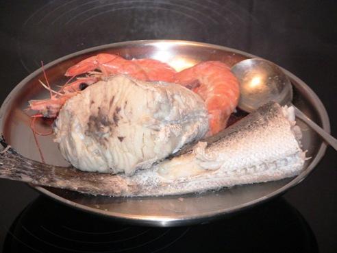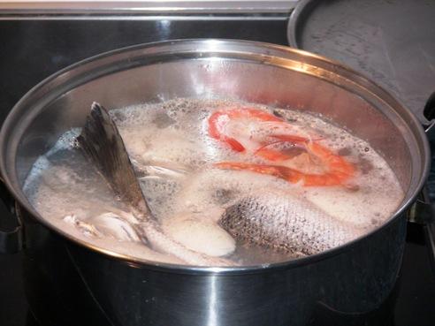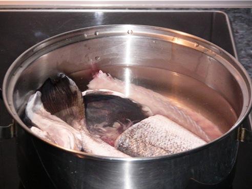 Por un lado cocemos el pescado acompañado de la zanahoria y cebolla, salamos al gusto y lo cocemos un poco, lo suficiente para poder desespinarlo, hay que tener en cuenta que luego va a cocer en el horno y no es necesario tenerlo mucho tiempo.