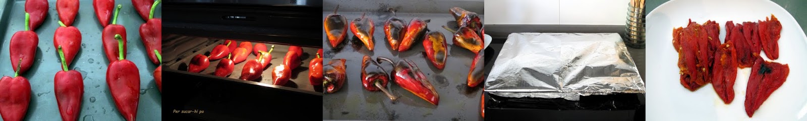 Lavar los pimientos. Untarlos con unas gotas de aceite y colocarlos en una bandeja. Asar en el horno con el grill fuerte para que se queme rápidamente la piel y no se consuma la carne. Retirar, dejar entibiar cubiertos con aluminio para que conserven humedad y pelarlos. Reservar.