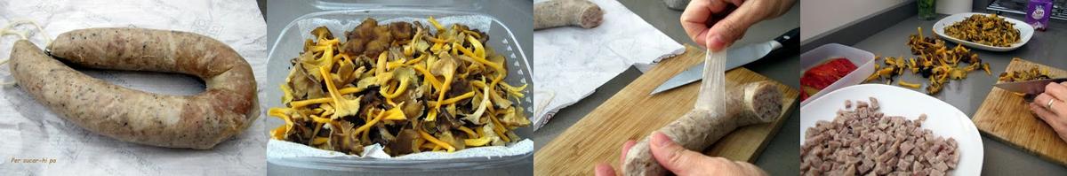 En una sartén al fuego calentar tres o cuatro cucharadas de aceite junto al los ajos picados. Antes de que empiecen a dorar añadir las setas, remover bien y sazonar. Dejar que evaporen el agua que sueltan. Añadir la butifarra, mezclar bien y dejar que se ablande. Echar el cognac y dejar evaporar el alcohol.Retirar del fuego y reservar.