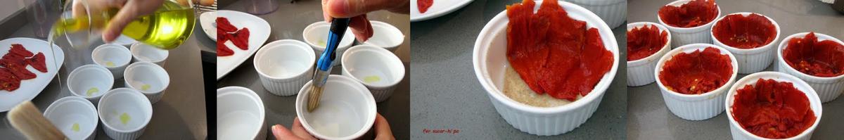 Untar el interior de los moldes a utilizar con aceite de oliva. Colocar los pimientos de manera que los moldes queden completamente forrados.