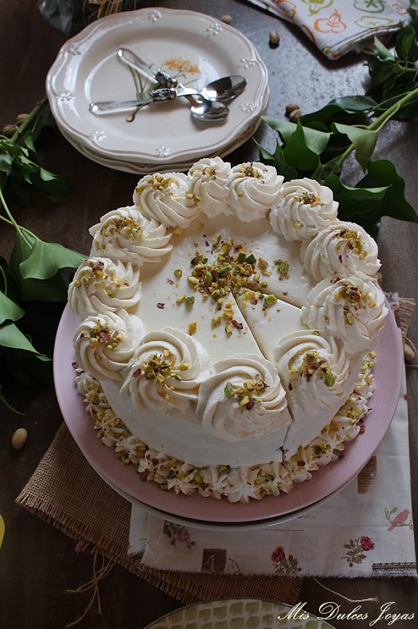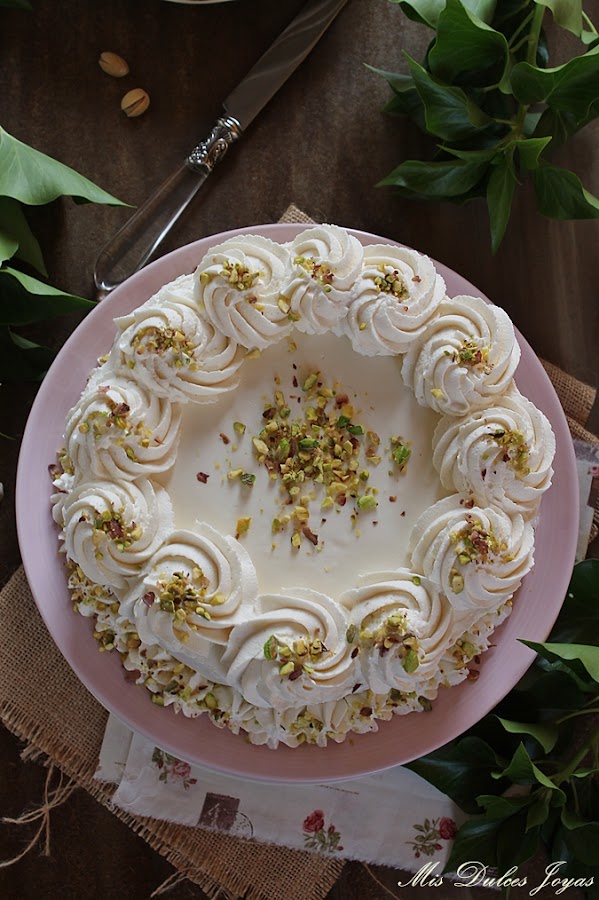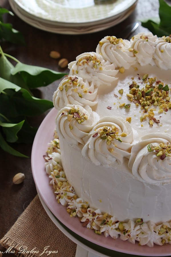 La receta original de este Layer Cake iba con otra crema, que a mi no me gustó nada, ni por la textura, ni por el sabor, además, estaba muy, muy dulce. Así que he preferido quedarme con una parte de la receta, concretamente con la parte de los bizcochos de pistachos (que me ha encantado), y he deicidio cambiar la crema por otra a mi gusto.