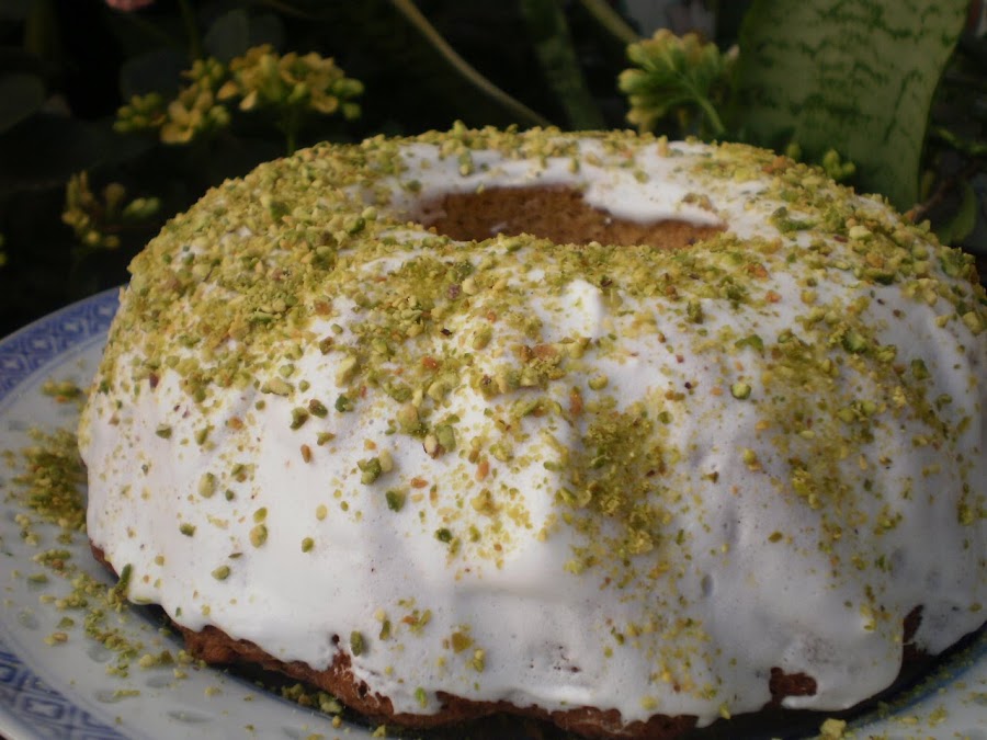 El glaseado lo hizo con colorante alimentario color pistacho, en su lugar se me ocurrió darle un toque de color con trocitos de pistachos triturados (Dice el refrán que a falta de pan: buenas son tortas).