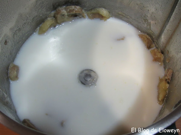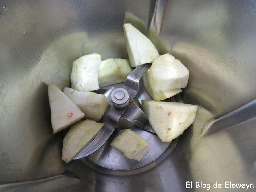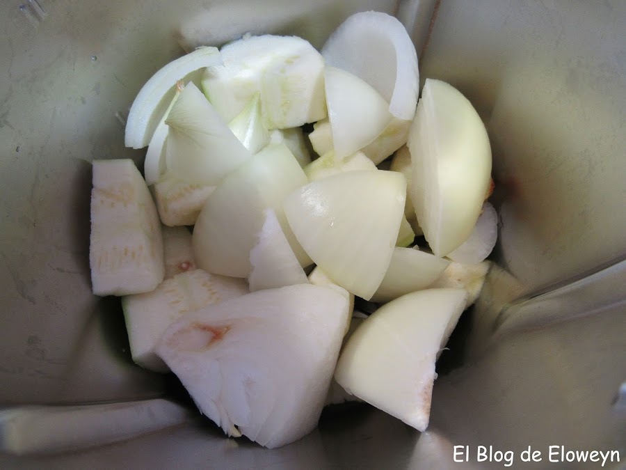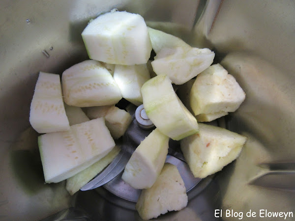 Pelamos la berenjena, la partimos en trozos grandes y la ponemos en el vaso de la Thermomix.