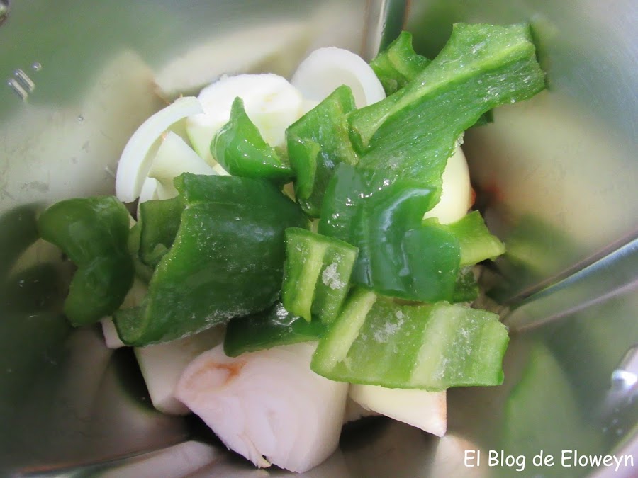 Lavamos el pimiento verde y le quitamos el rabito y las semillas. Lo partimos en trozos grandes y lo añadimos al vaso.