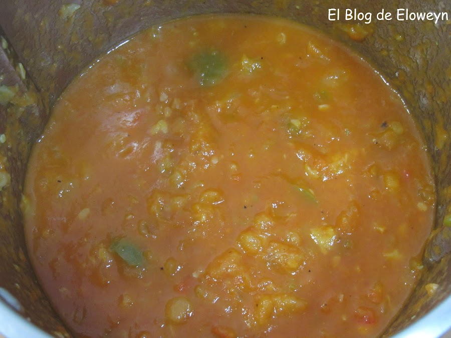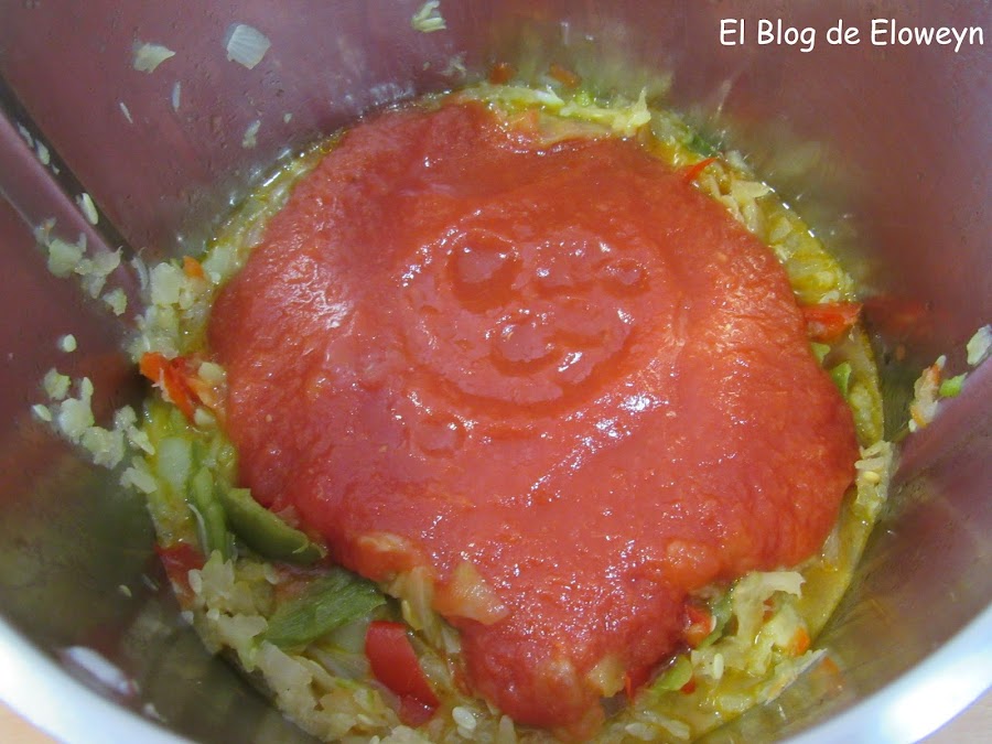 Una vez haya acabado el tiempo, añadimos el tomate natural triturado.