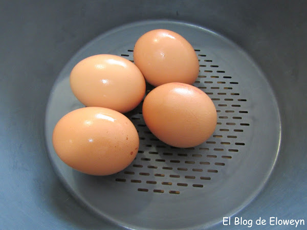 A continuación, lavamos bien los huevos con agua fría y una vez limpios los ponemos en el varoma. Los reservamos para más tarde.