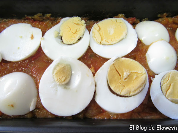 Pelamos y partimos en rodajas los huevos. Ponemos las rodajas sobre el pisto. Usé dos de los huevos para cubrir esta capa. Si queréis, podéis poner una pizca de sal (muuuy poquito) sobre los huevos, para que no estén sosos (esto va a gusto del consumidor).