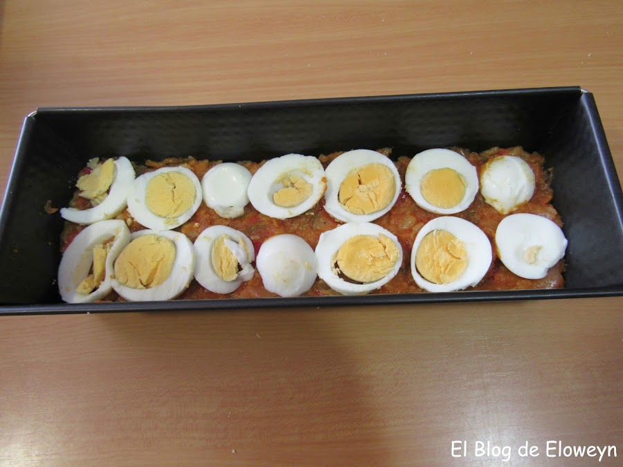 Ponemos los otros dos huevos partidos en rodajas sobre el pisto (si queréis, como la otra vez, añadid un poquitín de sal sobre los huevos)