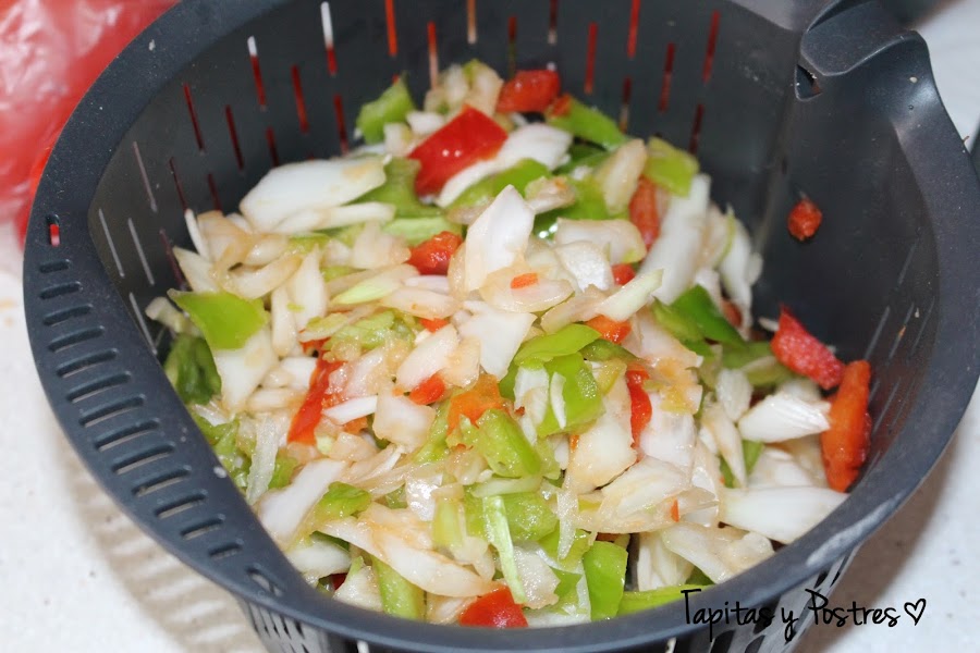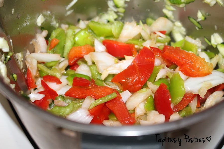 Primero hacemos el pisto y lo dejamos enfriar. Si lo hacemos de un día para otro está mas rico.Ponemos los dos pimientos bien lavados y la cebolla a cuartos en el vaso y troceamos 4 segundos a velocidad 4. Lo sacamos un momento para cortar el calabacín pelado, con piel (solo quitamos los extremos) y a trozos. Cortamos 2 segundos a velocidad 4. Agregamos las otras verduras reservadas, el aceite y cocinamos 15 minutos a temperatura varoma, giro a la izquierda y velocidad cuchara.