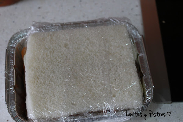 Ponemos el pan de molde en el fondo. Es conveniente que se cubra bien el molde, si hace falta ponemos tiras de pan para que esté bien cubierto. Encima ponemos una capa de psito.
