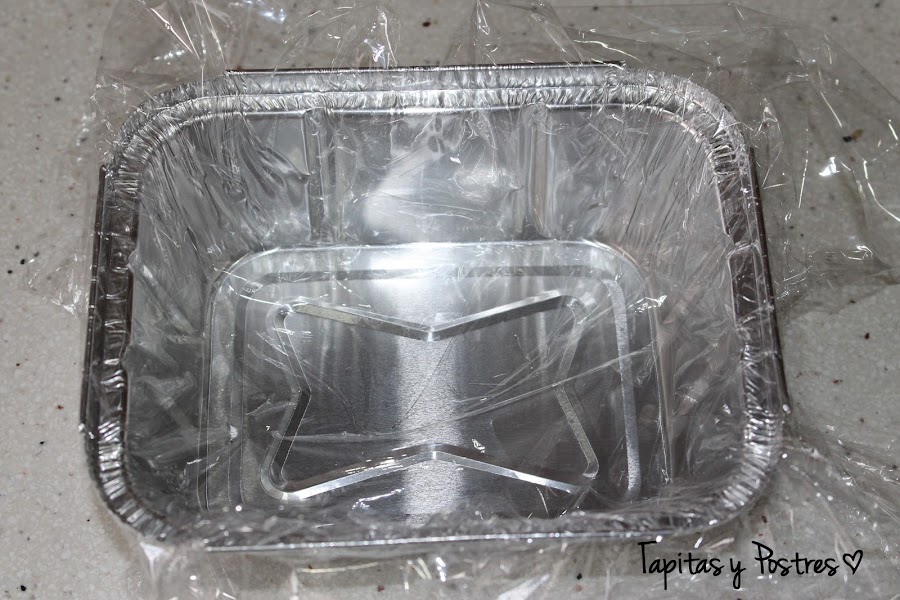 Ponemos film transparente en un molde, yo lo he hecho individual y he usado un molde pequeño cuadrado. Podemos hacerlo en un molde alargado si es para la familia.