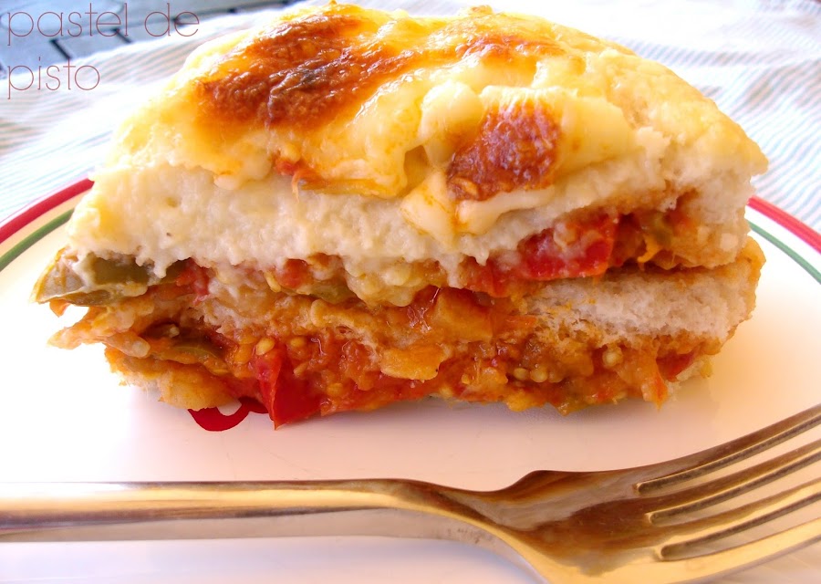 extiende la mitad del pisto sobre la capa de pan y dos huevos cortados en rodajas