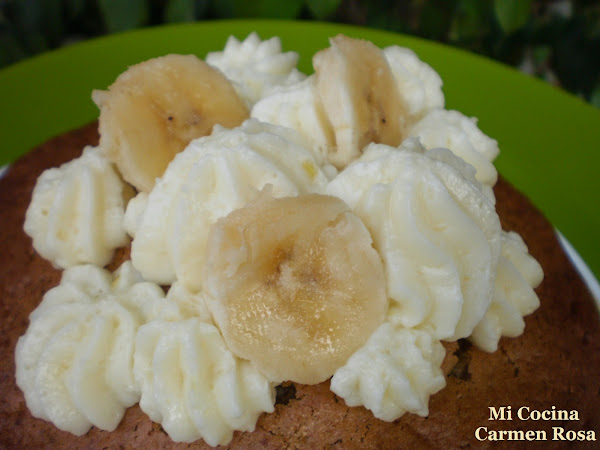 Un suave y tierno pastel de plátano, que he glaseado con una exquisita crema de mantequilla; con él he podido aprovechar plátanos muy maduros que sin darme cuenta quedaron atrás, demasiado blandos para comer.