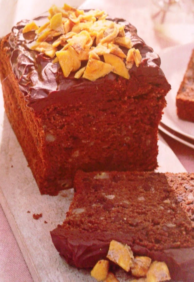Lo sacamos y dejamos enfríar en el molde encima de una rejilla. Para hacer la superficie, deshacemos el chocolate juntamos con la crema ácida al baño María con la ayuda de un cazo con agua hirviendo y poniendo sobre este un recipiente resistente al calor. Lo dejamos en el frigorífico hasta que tenga una consistencia que se pueda untar. Sacamos el pastel del recipiente. Le untamos bien por encima y lo decoramos con los trocitos de plátano deshidratado.
