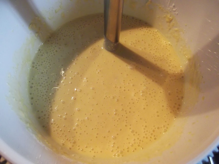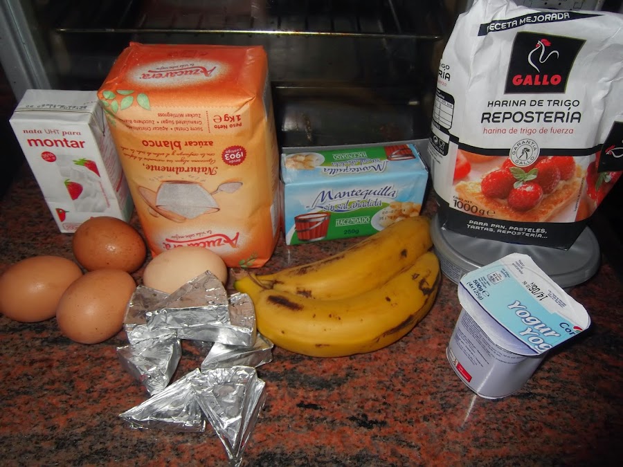 En un bol grande ponemos los huevos y el azúcar y batimos hasta que la mezcla doble su volumen. A continuación, añadimos el yogur, la nata (crema de leche) y los dos plátanos. Continuamos triturando con la batidora hasta que no queda ningún trozo de los plátanos. Ponemos los dos tipos de queso y seguimos triturando hasta que se deshagan totalmente. Por último, integramos la harina, eso si tamizarla primero para que no quede ningún grumo.