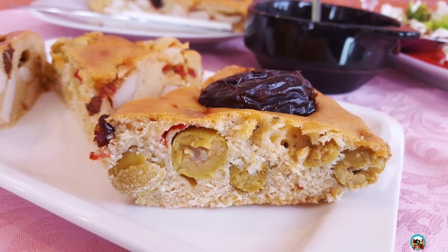 3.- Escurrimos el pimiento. lo cortamos el tiras y lo añadimos. Escurrimos las aceitunas y las tiras de pollo, mezclados todo nuevamente. Engrasamos un molde redondo con un poco de margarina y le esparcimos un poco de harina por encima y vertemos la masa dentro. Decoramos con los dátiles. Precalentamos el horno a 180ºC y cocinamos el pastel de pollo 35 o 40 minutos hasta que este hecho por dentro. lo retiramos del horno y lo dejamos templar unos minutos.