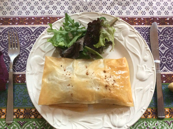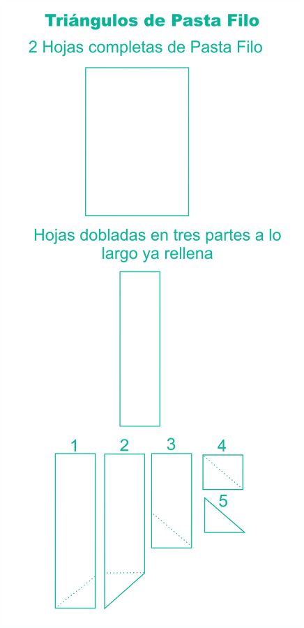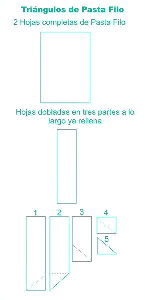 Se puede hacer de muchas maneras diferentes pero para que quede grande para que sea una ración por persona, recomiendo que se coloquen dos hojas de masa filo una encima de la otra, entre capas la mantequilla derretida,y se ponga el relleno casi como un rectángulo en el centro. y se dobla como si fuese un paquete, metiendo los extremos hacia abajo para que no se abra. Cuando ya está cerrado se pone un poco más de mantequilla por encima.