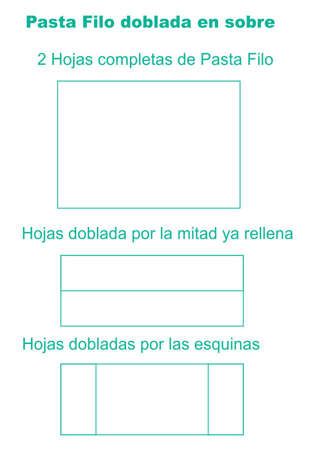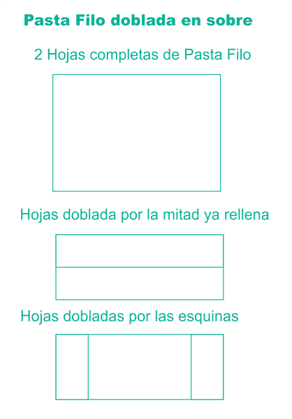 Aquí os dejo estas dos posibles maneras de doblar nuestro pastel de pollo con masa filo. Yo lo hice como en sobre, Es fácil y queda el relleno bien dentro sin posibilidad de salirse. Recordad que hay que poner dos o tres hojas (al gusto del cocinero).