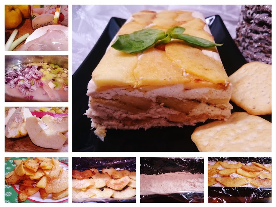 3.- Ponemos las pechugas cortadas en trozos en un vaso, añadimos el caldo, la nata (crema de leche) y la pimienta molida. Trituramos todos hasta conseguir una pasta parecida a un paté. Cubrimos un molde rectangular con papel flim. Ponemos primero una capa da membrillos, la cubrimos con el paté de pollo, (1/2 cm de grosor).