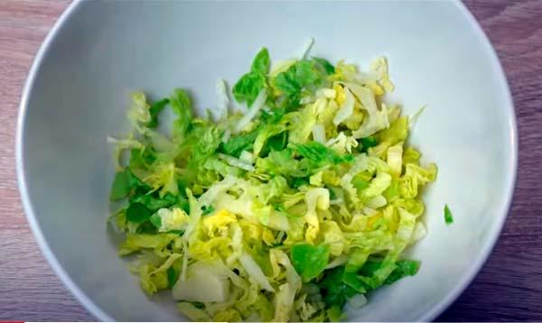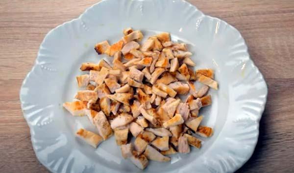 En primer lugar, preparamos los filetes de pollo a la plancha o en la sartén unos minutos por cada lado. Los sacamos en un plato, los dejamos enfriar y los cortamos en trocitos pequeños.Ahora, lavamos bien la lechuga, la cortamos también en tiras finas y la secamos con papel absorbente para quitar todo el exceso de agua. Este paso es importante para que después no se nos humedezca el pastel.