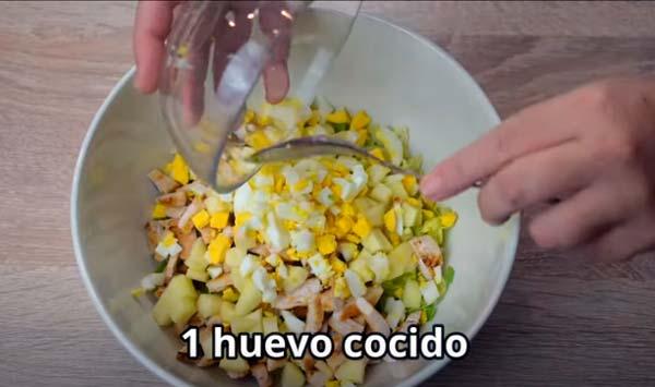 Ponemos la lechuga ya cortada en un recipiente, le añadimos el pollo a trocitos, media manzana pelada y cortada en dados pequeños, un huevo cocido también en trocitos y unas cucharadas de mayonesa o si lo prefieres lactonesa.