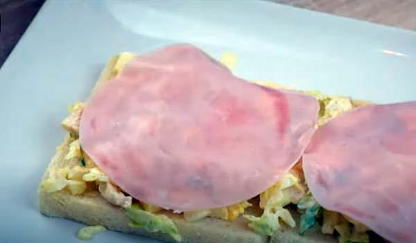 Colocamos unas lonchas de jamón cocido encima y de nuevo le ponemos 2 rebanadas de pan. Apretamos un poco para que vaya quedando compacto.