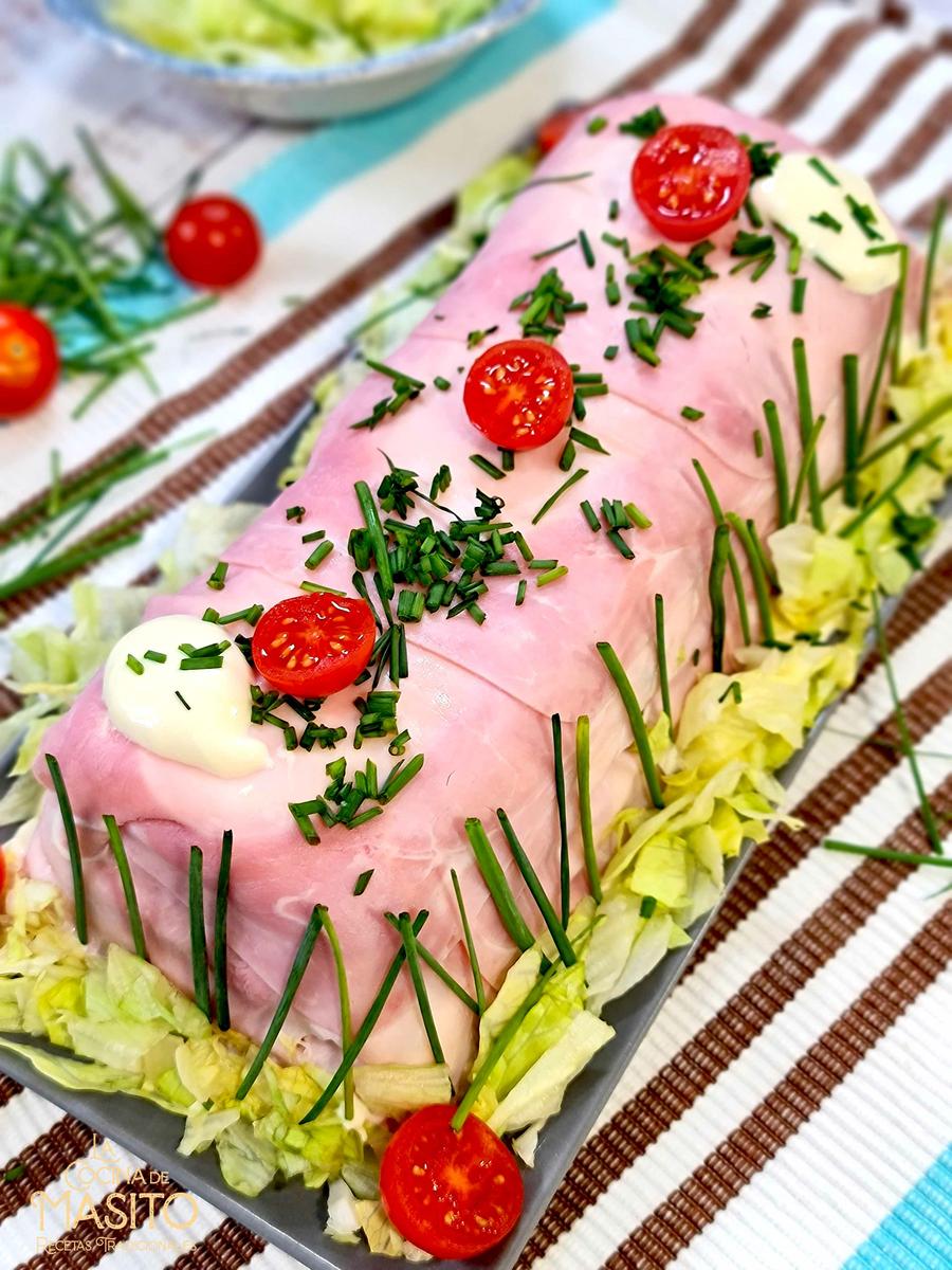 11. Le quitamos el papel film, lo desmoldamos y decoramos al gusto. Yo os propongo agregar mayonesa en los laterales.