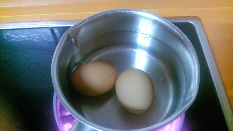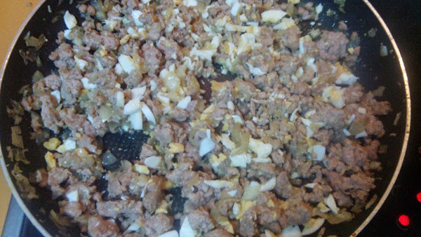 Mientras ponemos a cocer los huevos. Una vez listos apartamos, enfriamos bajo el chorro de agua del grifo, los picamos y añadimos al sofrito de carne. Mezclamos bien todo.