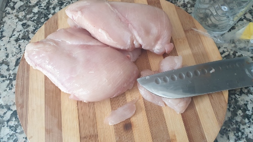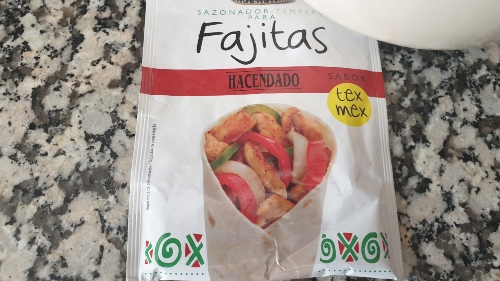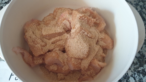 1- Trocear las pechugas en dados y adobar con sal, pimienta, ajo en polvo y sazonador de fajitas. Reservar.