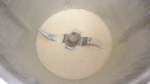 5- Sin lavar la cubeta, calentar 1 cda. sopera de aceite y mantequilla en menú plancha. Añadir la harina, sofreír un minuto e ir echando poco a poco la leche hasta que espese, sal, pimienta y nuez moscada.