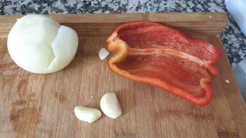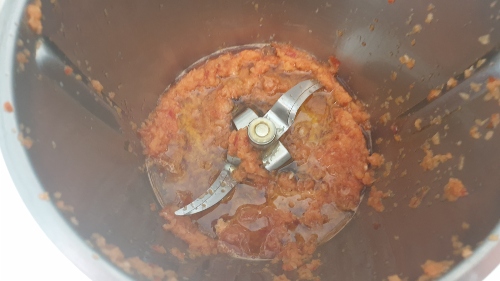 2- Picar la cebolla, ajos y pimiento rojo, 4 seg. vel.4.