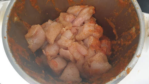 4- Pollo adobado en dados, 10 min., Varoma, giro izda, vel.1, con cubilete.