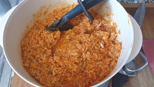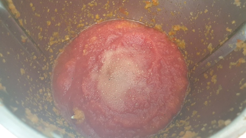 3- Agregar el tomate, sal y azúcar, remover bien: Válvula cerrada, menú turbo, 5 minutos, alta presión, 130º.