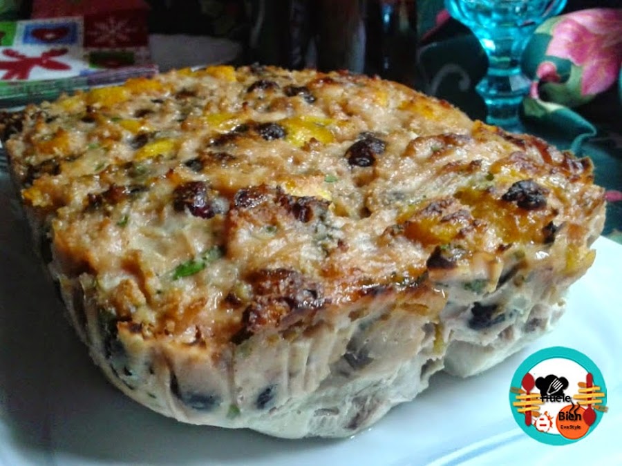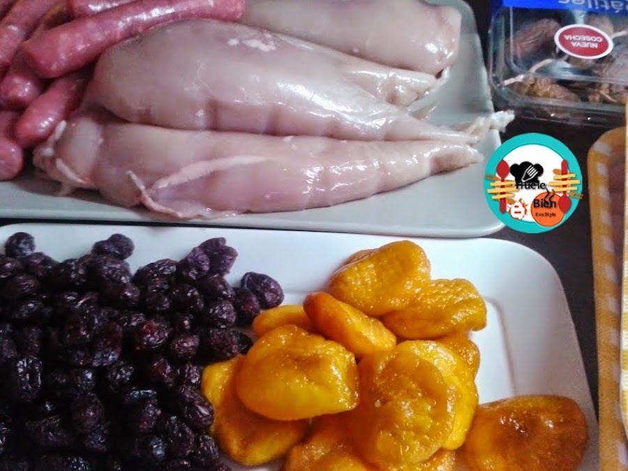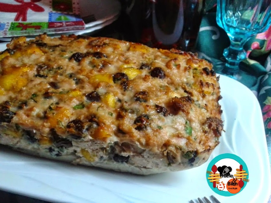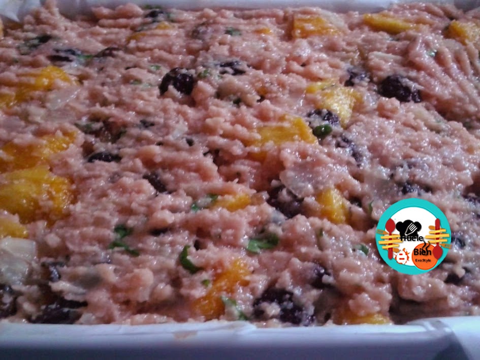 2.- Trocemos los frutos secos, los mezclamos con la carne picada. Salpimentamos, añadimos la almendra molida, un poco de jerez, el brandy y las hierbas aromáticas picadas finamente. Amasamos todo con las manos. Ponemos los huevos y mezclamos todo bien, hasta conseguir una pasta.