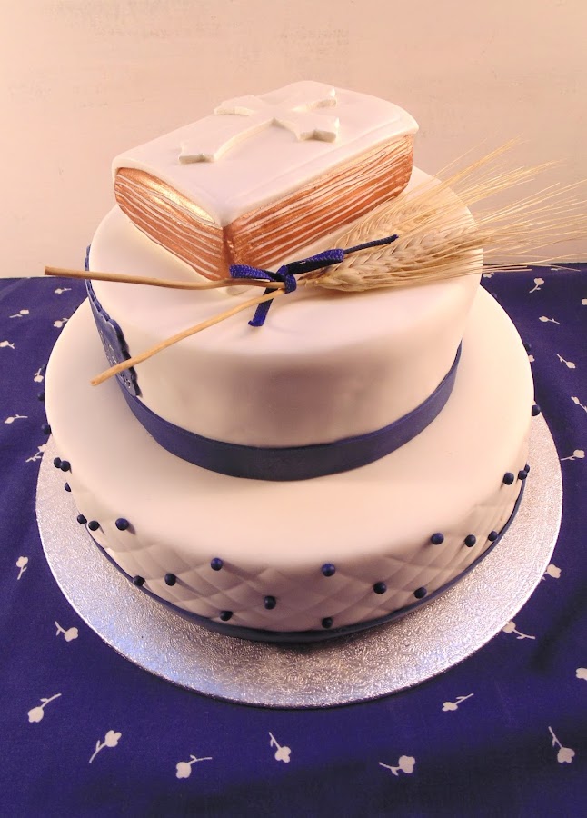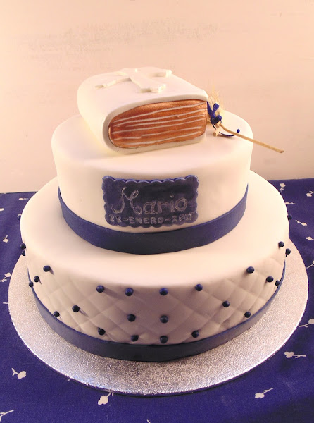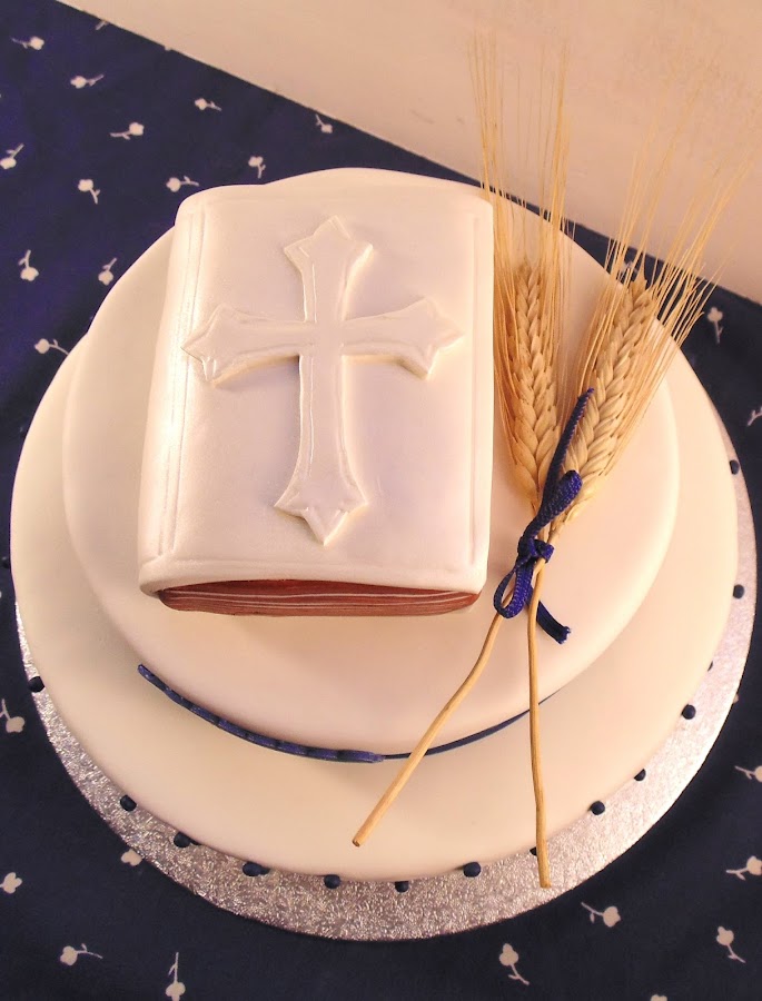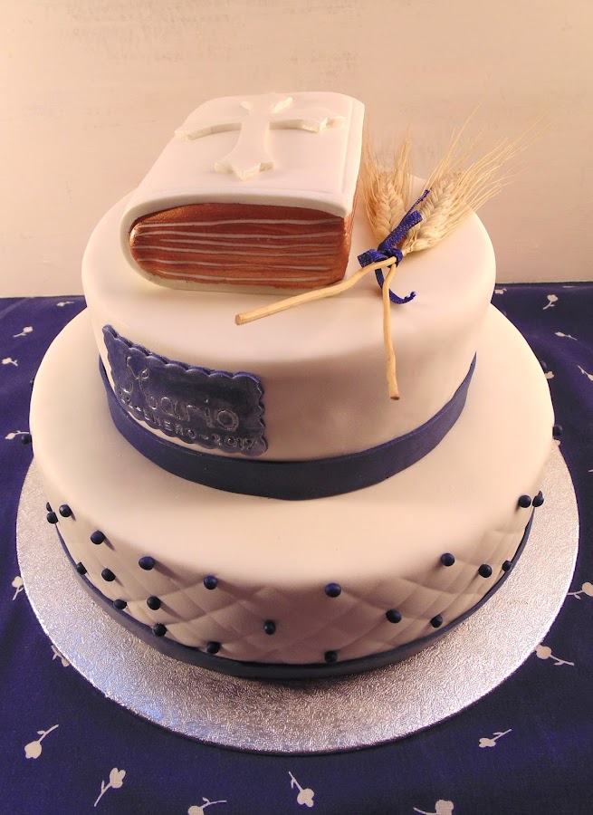 Las cintas estan hechas de fondant y para que se parezcan un poco a las de mercería, tienen una fina capa de polvos comestibles iridiscentes, al igual que el misal, que así adquiere un aspecto nacarado.