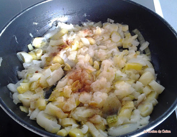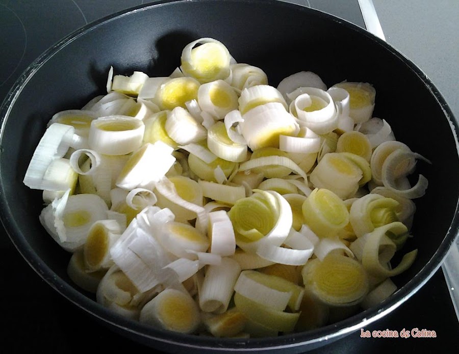 Pelamos la cebolla y los puerros y los cortamos en rodajas finas, y los ponemos a freír en una sartén con cuatro cucharadas de aceite. Salpimentamos.